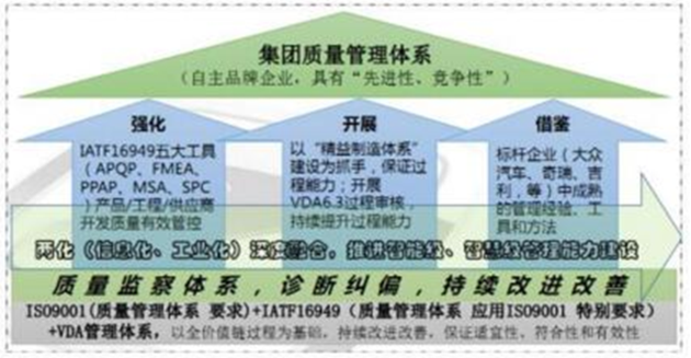 眾泰汽車正在建立以ISO9001+IATF16949為基礎的質量管理體系,全面導入和實施IATF16949五大管理工具;各供應商全面推行IATF16949質量體系標準;建立眾泰汽車的精益管理體系(即“ZTPS精益管理體系”);并且推動兩化(信息化、工業(yè)化)深度融合,推進智能化管理——建立行業(yè)自主品牌標桿管理模式,即“眾泰質量管理體系”。